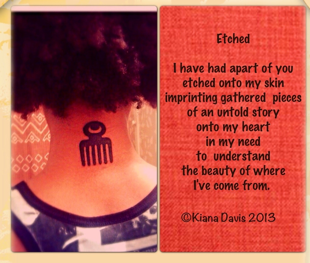 I have had apart of you etched onto my skin imprinting gathered pieces of an untold story onto my heart in my need to understand the beauty of where Ive come from. ©Kiana Davis August 2013