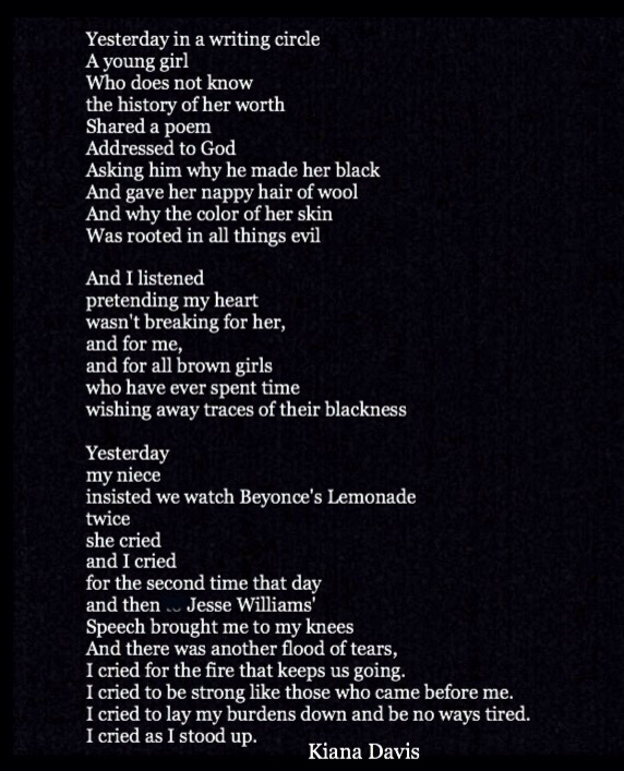 Yesterday I was teaching a poetry workshop and a young girl’s poem about being Black broke my heart. I remember being her age and living with a similar pain. Yesterday was cathartic.